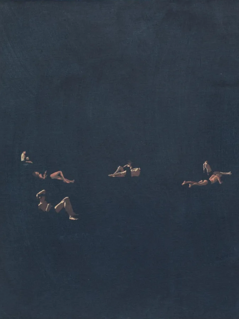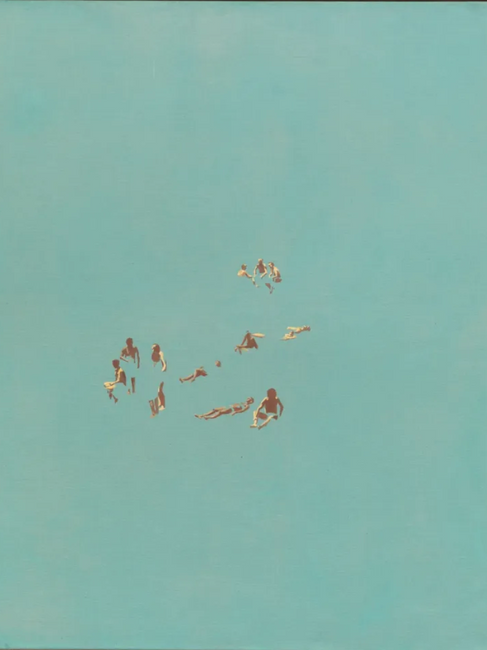 For Other Places, he derives inspiration from travelling and the concept of postcards, seamlessly combining both to craft stimulating narratives. His practice is usually influenced by found imagery. “I look at postcards a lot and travel brochures, often quite old ones, for these paintings. They capture leisure and the way that we think about work and leisure, along with the going away aspect of holidaying. I tend to encounter those images, and from there I just end up putting them in decontextualized spaces. When you think of travel, there’s a kind of wish-you-were-here sentiment on postcards. These are wish you were here, but without the ‘here.’ Sometimes it’s just about the particular location or setting and the figures are just incidental. Here, the figures become the subject.”