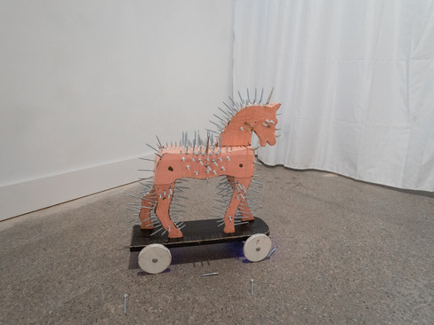Baburskova’s curatorial framing emphasises this emotional ambiguity. The exhibition refuses the tidy arc of consolation. Viewers recognise forms instantly (the suitcase of Carry On, 2026; the rocking horse of Play With Me, 2026), yet the inability to engage them comfortably produces a quiet unease (Carry On is wrapped in power adapters, electrical wires and plastic, Play With Me is covered in spikes). That disjunction suggests a wider contemporary condition: domesticity experienced as desire alongside instability, intimacy alongside risk, familiarity alongside estrangement.