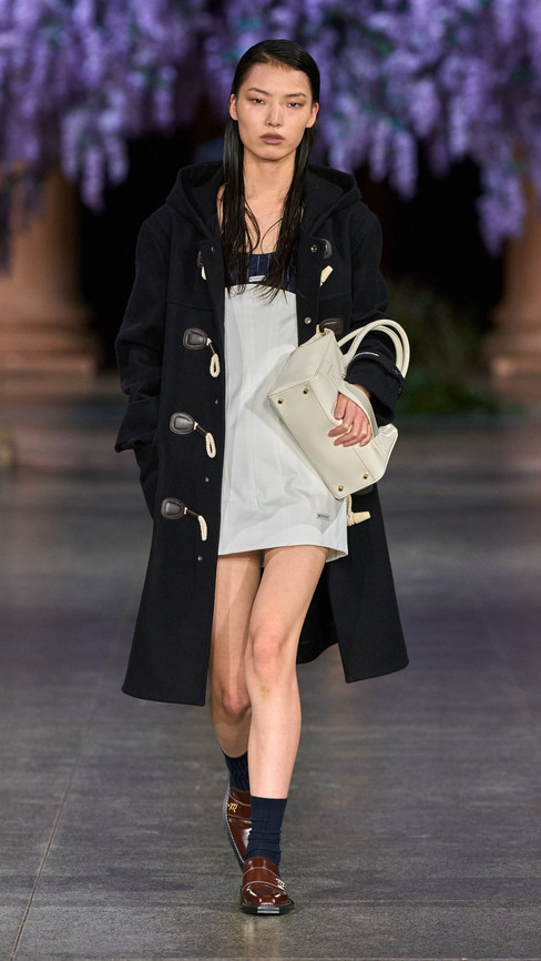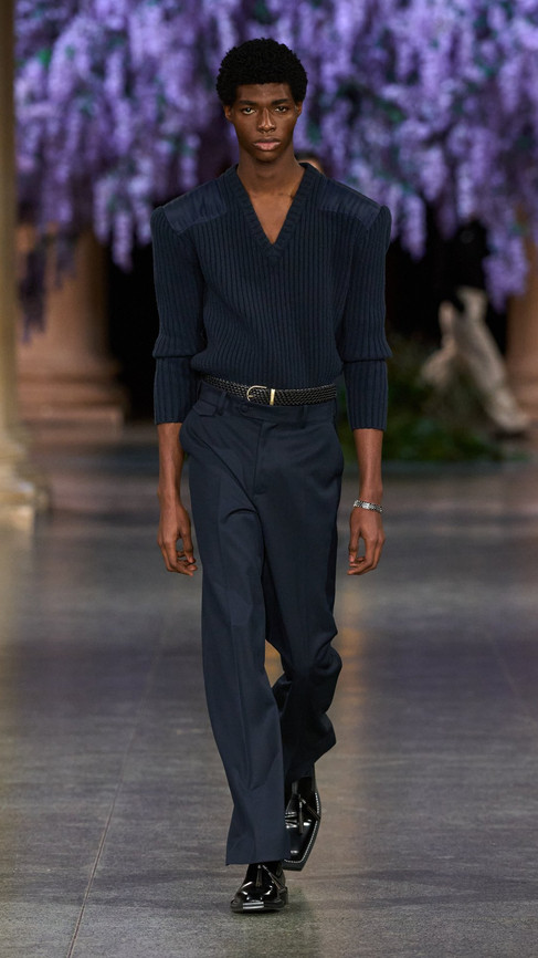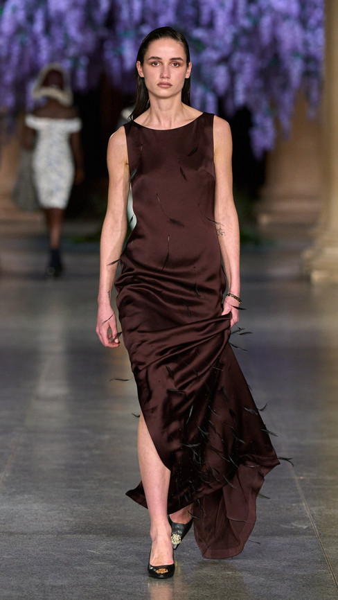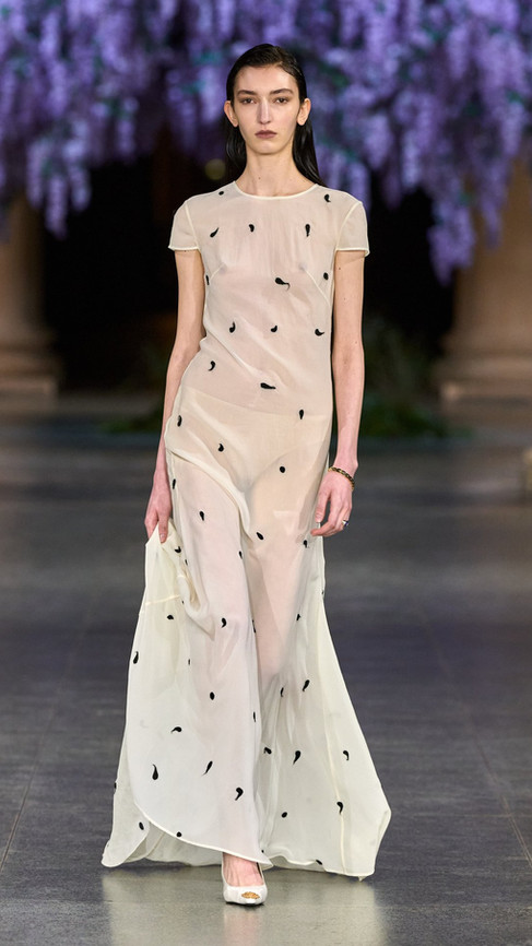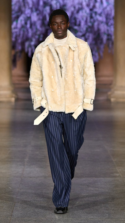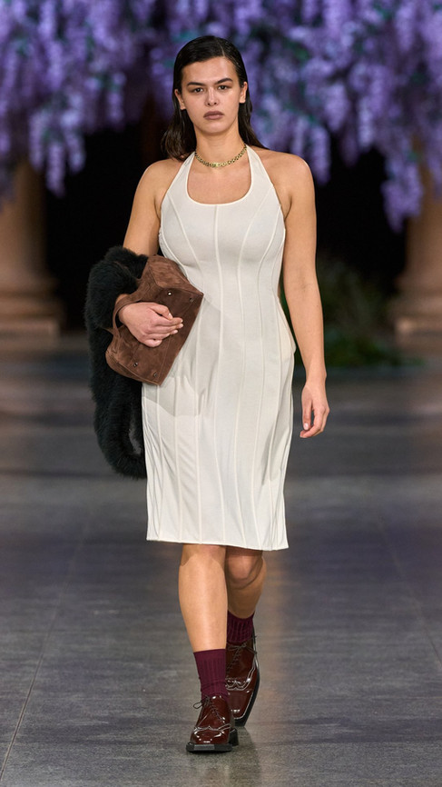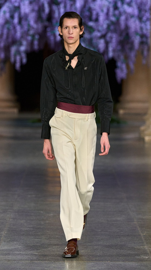Creative director Daniel Fletcher’s third collection with the brand, Mithridate AW26 felt in many ways like a consolidation; a statement that he is here to stay. The whole show felt very cinematic: from its staging, a giant wisteria tree centrepiece (wisterias bloom in the spring not autumn, but I’ll let it slide) in the main hall of the Tate Britain, all the way to the clothes themselves, which felt strangely reminiscent of the films of the 90’s and 00’s. The most noticeable nod to cinema was certainly the references (if I may infer that they were, in fact, references) to Mary Harron's 2000 movie American Psycho, eternal cinematic fashion darling. Featuring tailored suits worthy of Fletcher's Savile Row training, in tweeds, wools and the occasional cummerbund, coupled with slicked back hair and outrageously large valise’s, Fletcher's works evoke Patrick Bateman on a misty English moor. Women’s tailoring brought an especially strong sense of drama to the show, with boned suits, big shoulders and structured garments, presumably set with enough starch to provide for a small nation.